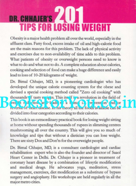 201 Tips for Losing Weight by Dr. Bimal Chhajer All obese people want to lose weight. But they do not understand the science behind this weight gain and loss. They do not know which foods are helpful for losing weight and which are for gaining weight. Seeing the lucrative advertisements from slimming centers they empty their pockets and join them in the hope of losing weight. They lose weight and gain them back after they discontinue the slimming centers — as the knowledge is still missing. This book is an attempt to educate the people who really want to lose weight on their own.
